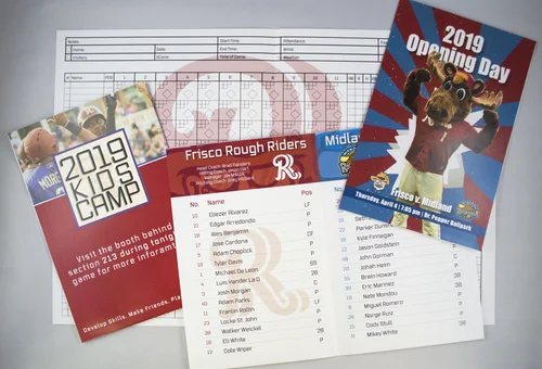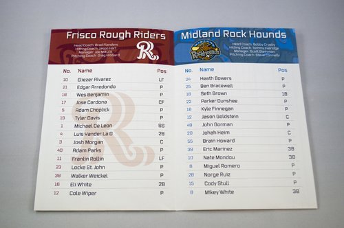 Game-Day Program design that would display the roster for each team playing, an advertisement for an upcoming kid’s camp hosted by the team, in addition to folding out to a useable scorecard for those who wish to score their own game.